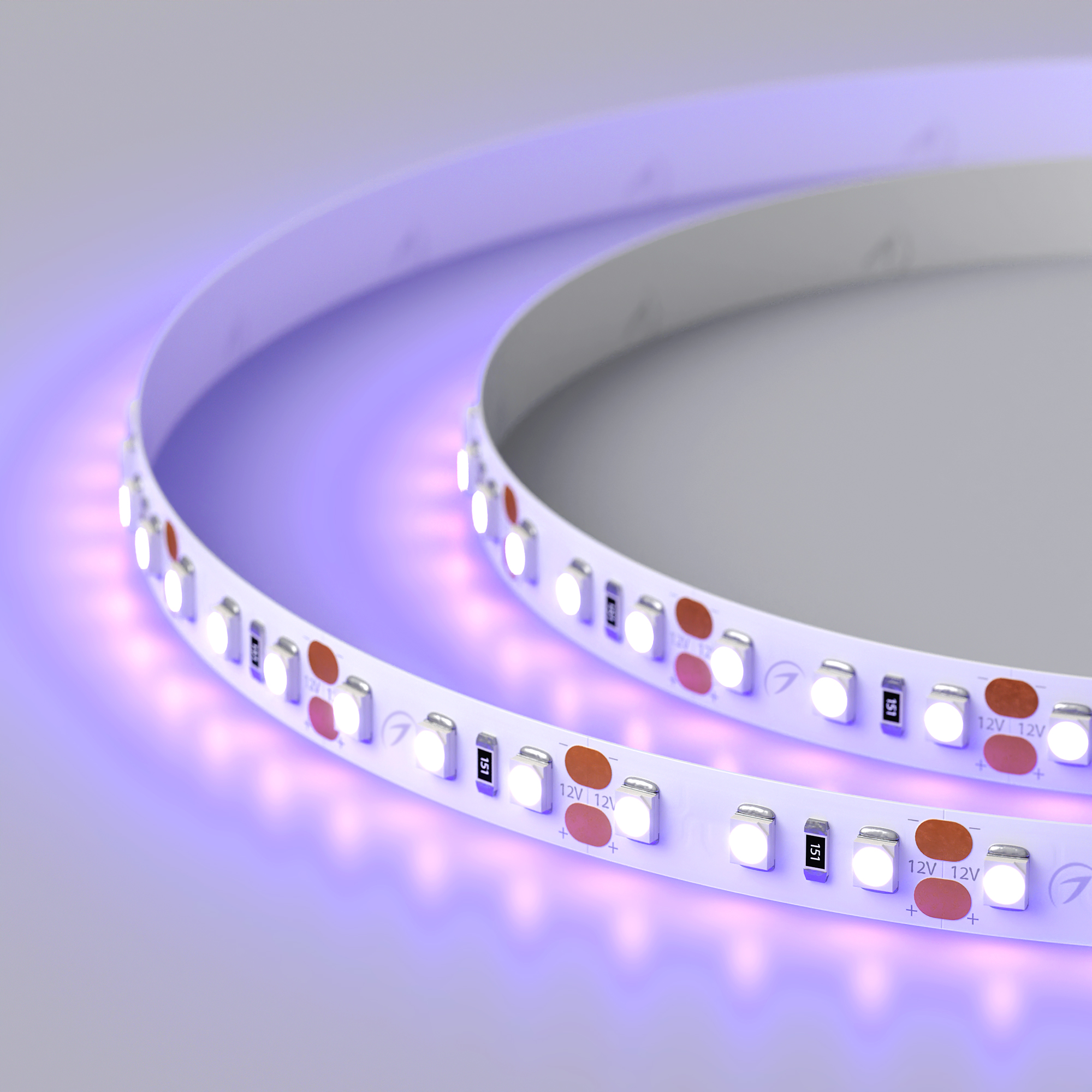 Гибкая лента LUX, светодиоды 2Х smd 3528, 120шт/м (600шт на 5м), белая плата 8мм, скотч 3М. Цвет ВИДИМЫЙ УЛЬТРАФИОЛЕТОВЫЙ 400нм. Питание 12В, мощность 9,6 Вт/м (48 Вт на 5м), угол 120°. Размеры 5000х8х1,8мм. Мин.отрезок 25мм (3 LED). Цена за 1м.