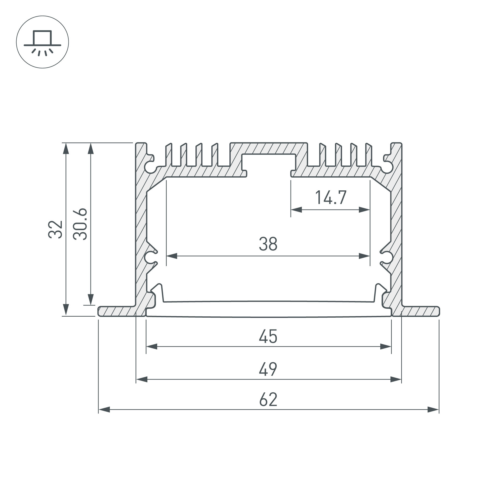 Габаритные размеры профиля составляют 2500 мм в длину, 62 мм в ширину и 32 мм в высоту. Площадка для установки светодиодных лент позволяет использовать ленту шириной до 38 мм и мощностью до 46,4 Вт/м. Это обеспечивает гибкость в выборе светодиодных лент и создает потрясающие световые решения.