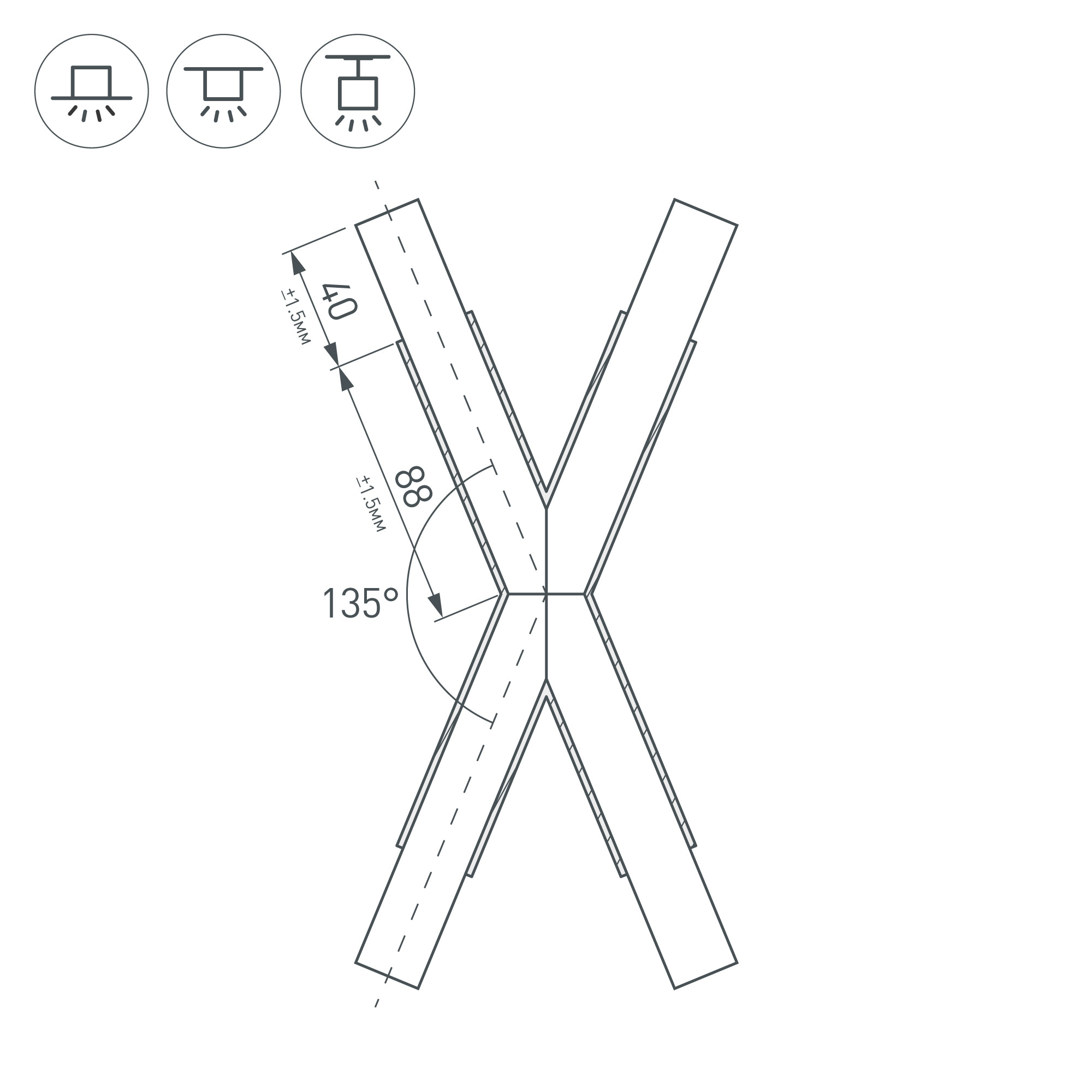 Крестовой угол в сборе для соединения четырех профилей PLS-LOCK-H25 под углом 135° в одной плоскости в комплекте с матовым экраном и соединителями. Экран образует Х-образную фигуру на плоскости. Применяется при изготовлении светильников сложной геометрии. Длина каждого куска профиля с места стыка в центре 88 мм, размер выступающей части экрана 40 мм. Цена за комплект.