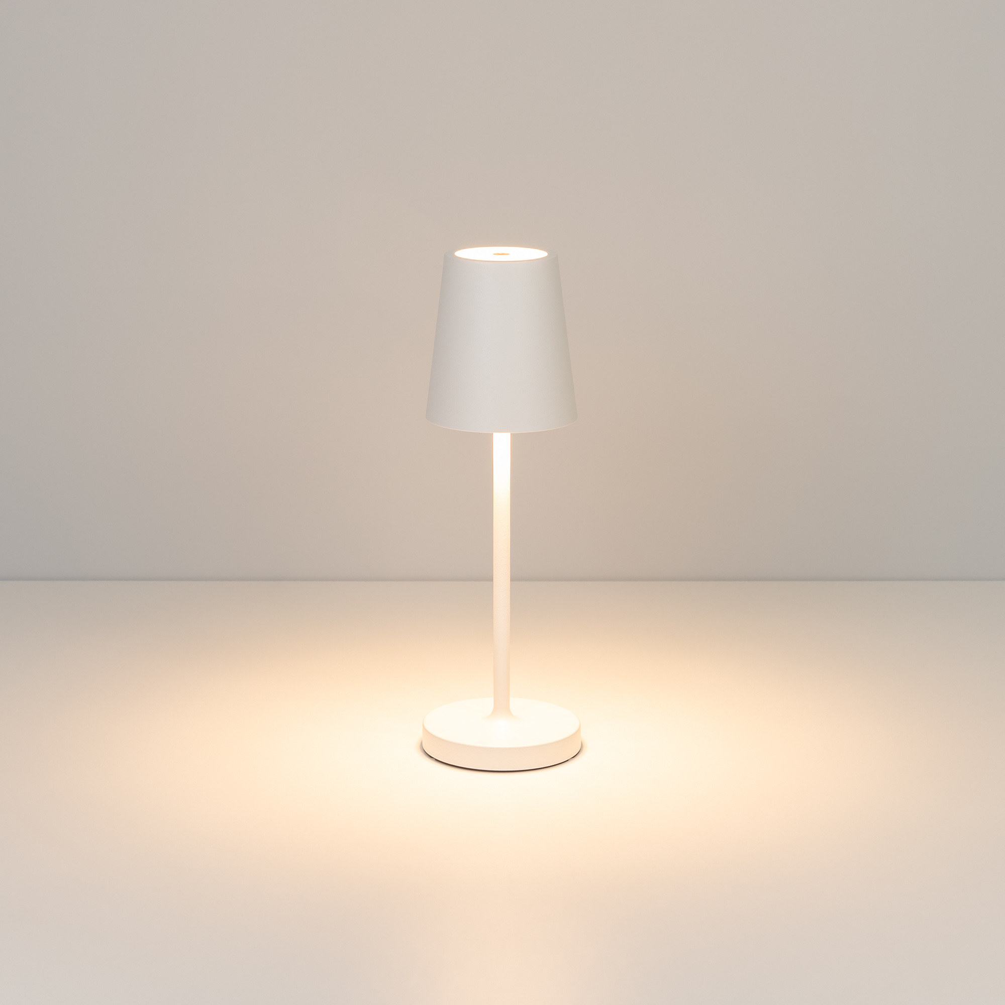 Настольный светильник со встроенным аккумулятором 1.5Вт, алюминиевый корпус, цвет белый. Цвет ТЕПЛЫЙ БЕЛЫЙ 2200-2700-3000K, св.поток 110-130 лм, CRI(Ra)>80, угол 90°. Размер Ф75x250мм. IP54. Зарядка от сети переменного тока AC220-240V. Тип встроенного аккумулятора 1500мАч Li-ion, напряжение батареи 3.7V