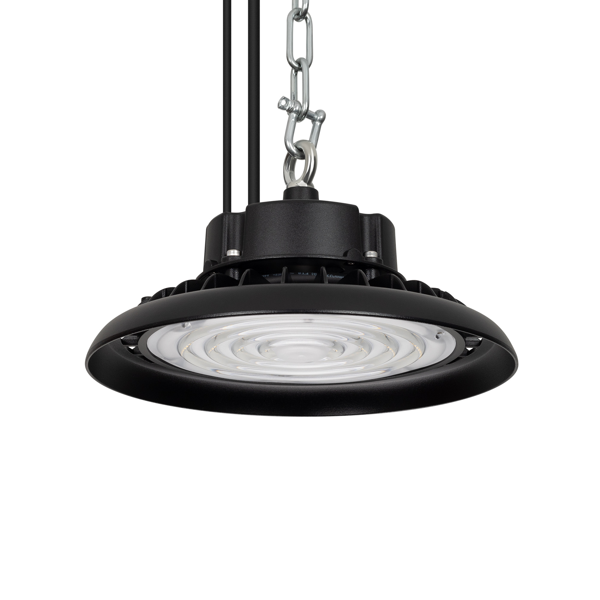 Светильник SP-ARIVA-DIM мощностью 100 Вт, дневного цвета свечения 5000K, световым потоком 15000 лм и углом рассеивания 90 градусов предназначен для освещения складских и промышленных помещений. Черный цвет корпуса, габариты Ф260xH140 мм., степень пылевлагозащиты IP65., индекс цветопередачи CRI 80, степень ударопрочности IK08. Доступно управление по протоколу 0-10В. Рым-болт в комплекте.