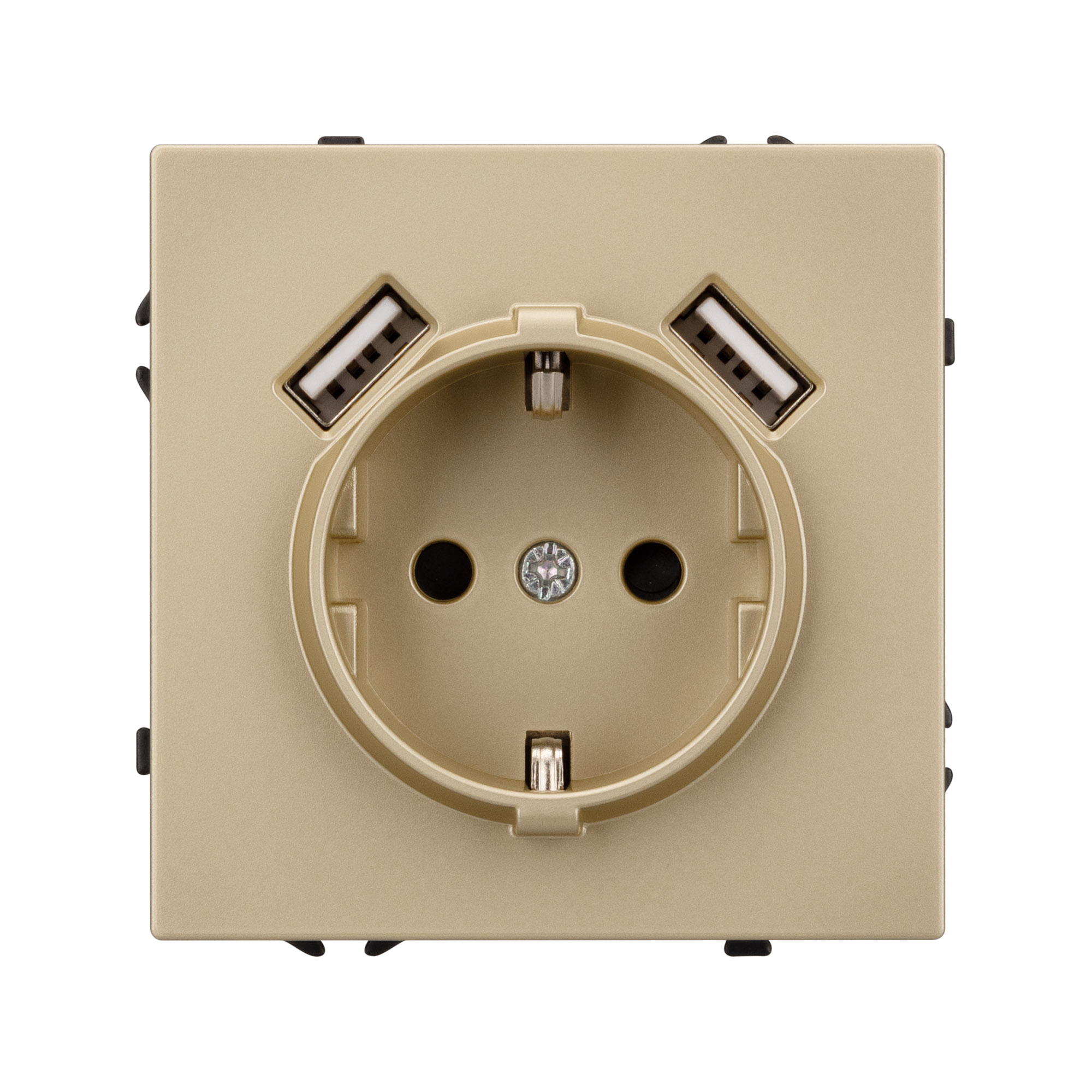 Механизм розетки с USB зарядкой, совместимый с рамками серии NOBE, создает утонченный минималистичный вид. Наличие двух USB Type A портов позволяет существенно сократить количество используемых розеточных постов под евровилку, сохраняя единую стилистику интерьера всего современного дизайн-проекта. Видимая часть механизма выполнена из высококачественного пластика золотого цвета и имеет Soft-Touch покрытие, что придает изделию приятные тактильные ощущения и стильный внешний вид.
