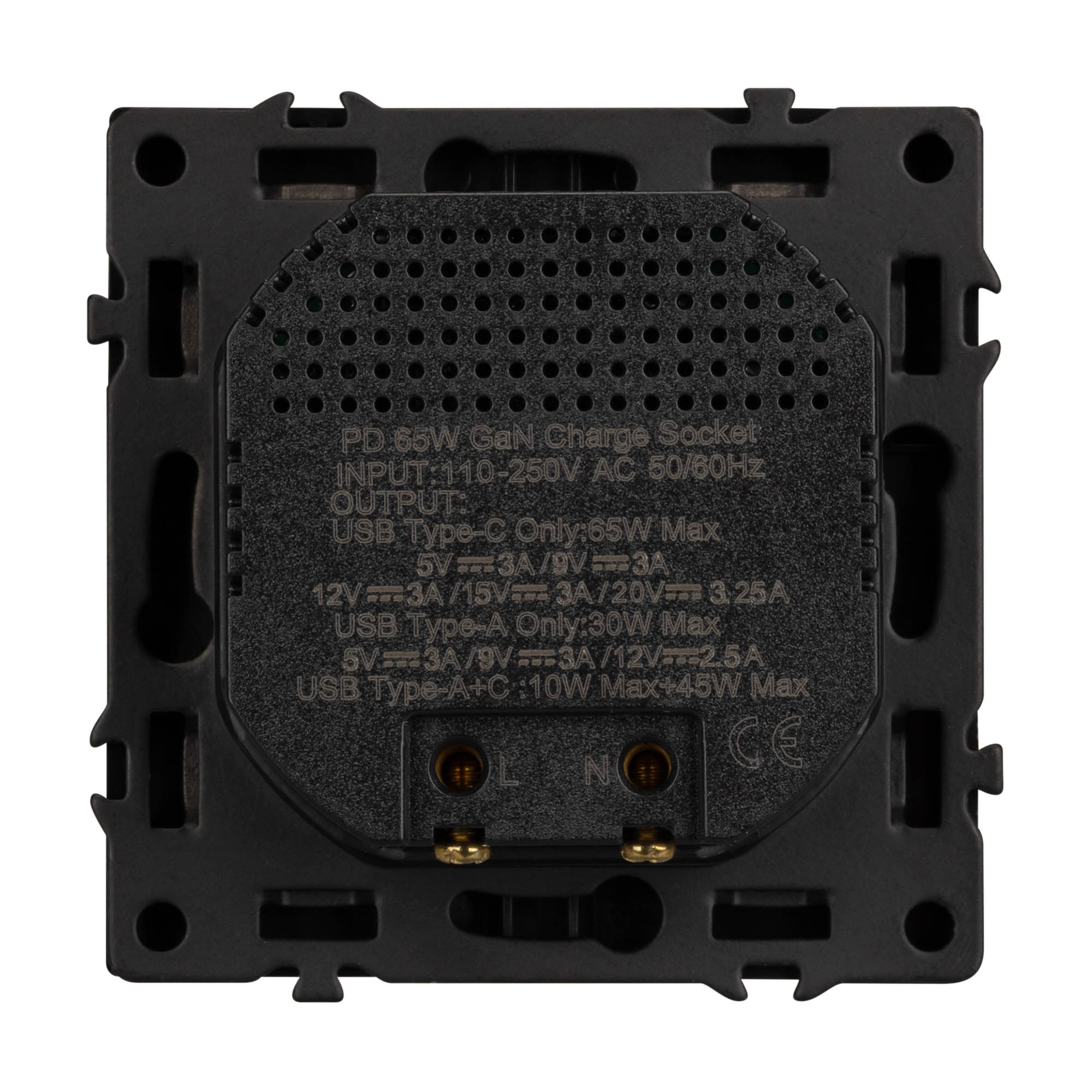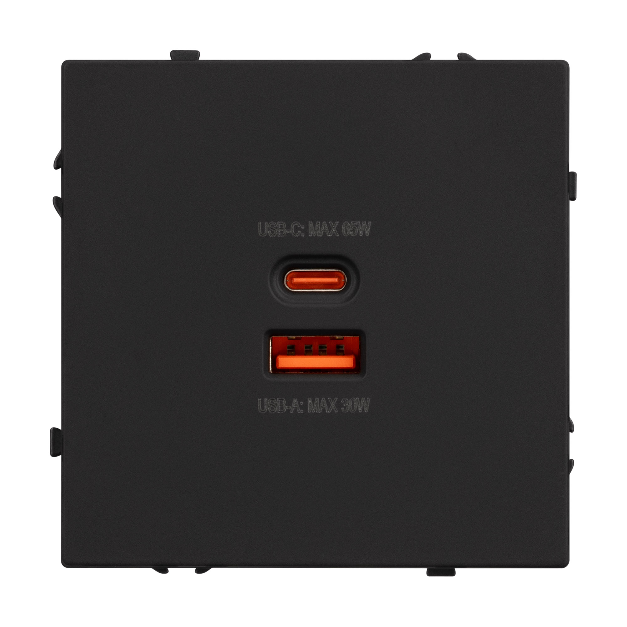 Механизм розетки с быстрой USB зарядкой, совместимый с рамками серии NOBE, создает утонченный минималистичный вид. Наличие USB Type A и Type C портов позволяет существенно сократить количество используемых розеточных постов под евровилку, сохраняя единую стилистику интерьера всего современного дизайн-проекта. Оба разъема поддерживают протокол быстрой зарядки Quick Charge QC 3.0, помимо этого для разъема Type C доступен протокол Power Delivery*.