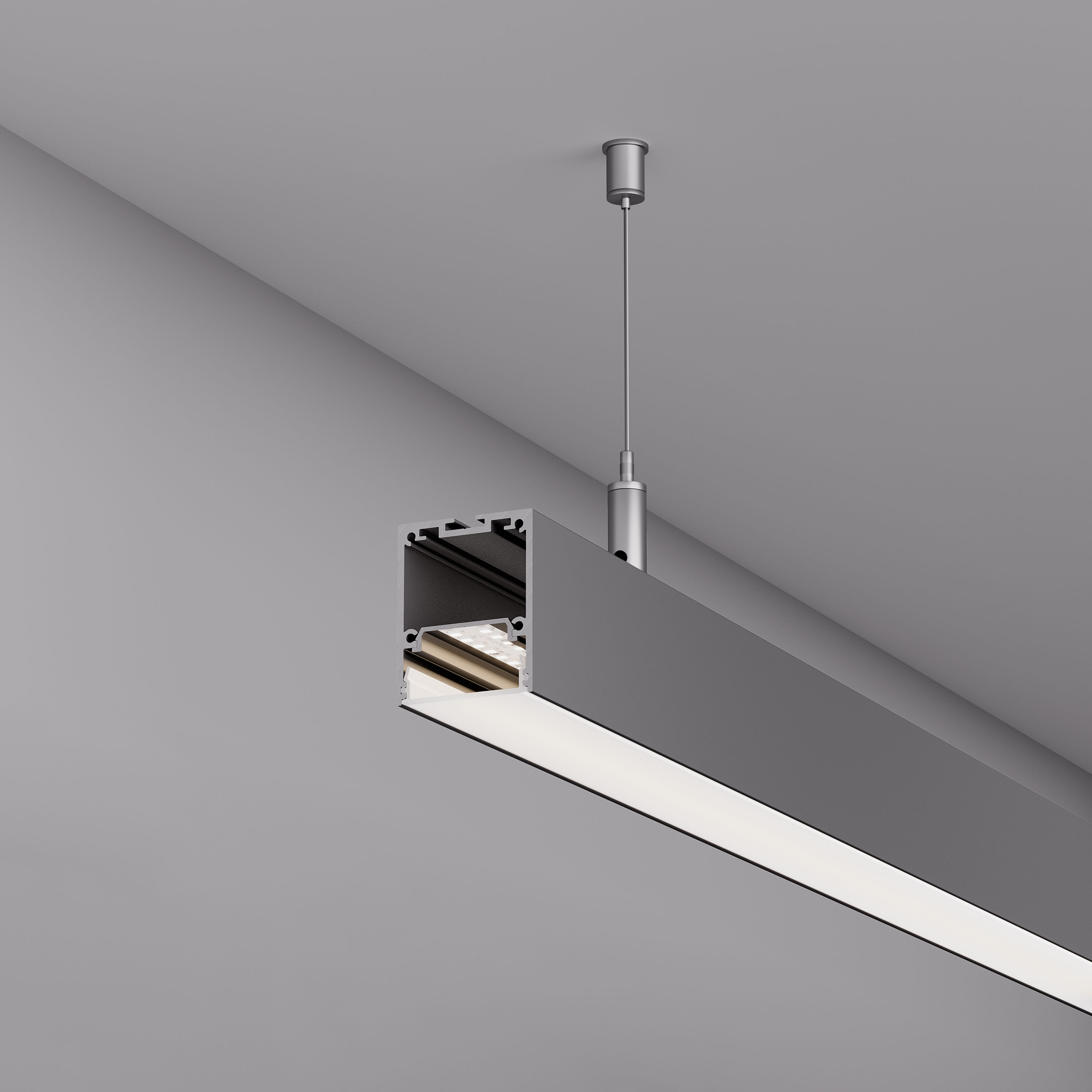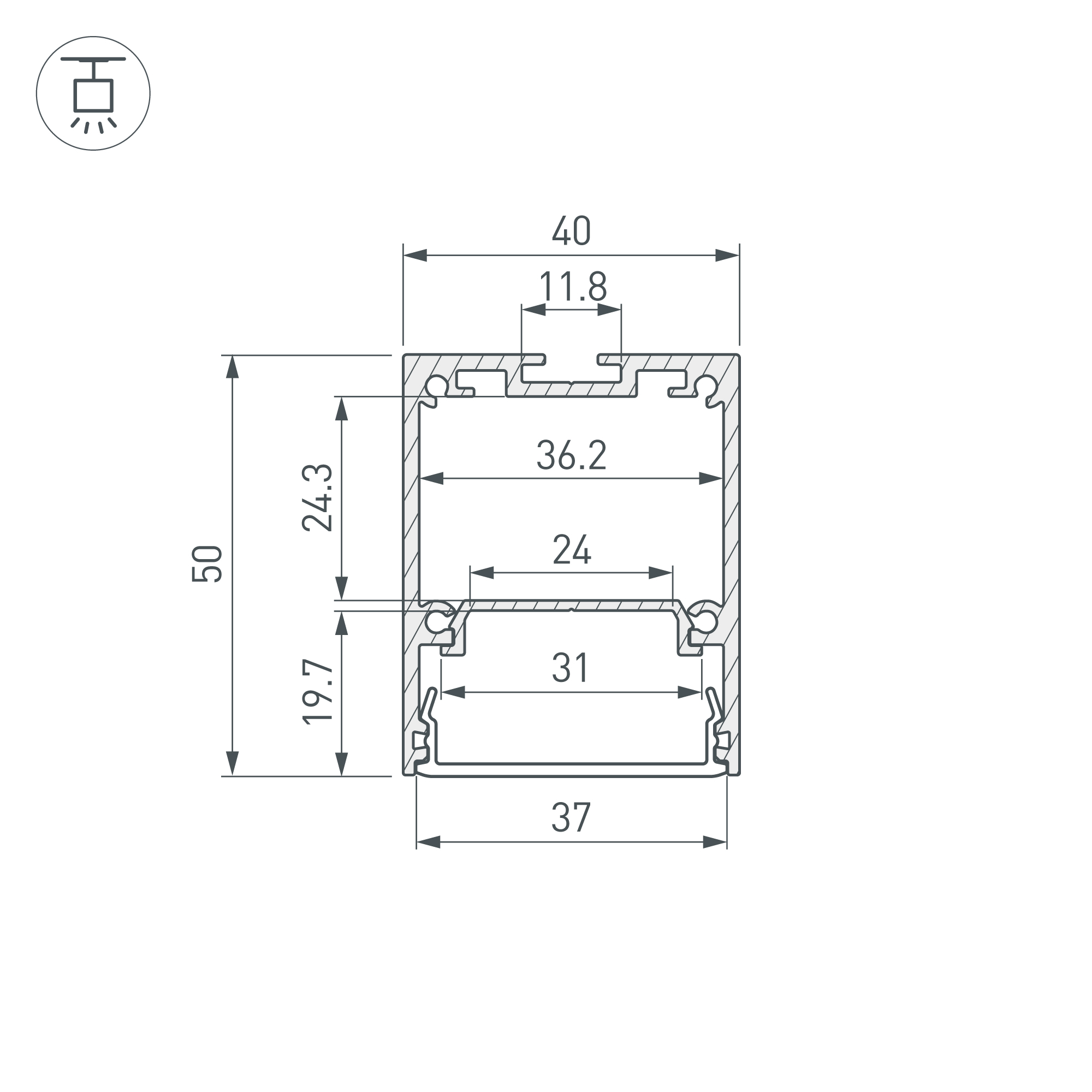 Накладной/подвесной профиль из анодированного алюминия серебристого цвета для основного освещения с возможностью герметизации до IP54 с помощью аксессуаров к профилю без дополнительного использования силиконового герметика, до IP65 с помощью аксессуаров к профилю при условии дополнительного использования силиконового герметика. Габаритные размеры профиля составляют 2000 мм в длину, 40 мм в ширину и 50 мм в высоту. Площадка для установки светодиодных лент позволяет использовать ленту шириной до 24 мм и мощностью до 36 Вт/м.