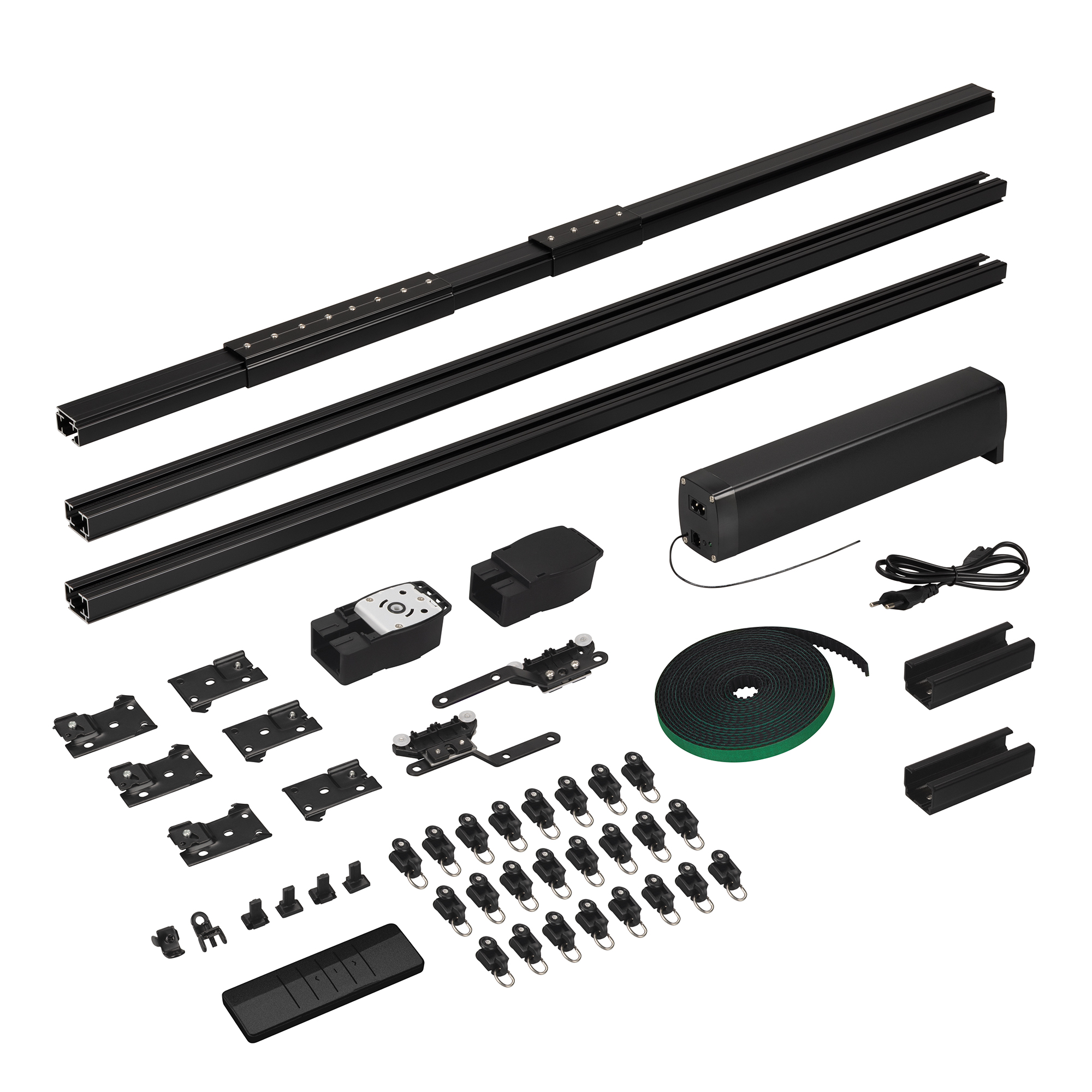 1 мотор, 1 пульт дистанционного управления, алюминиевый профиль 1,6 мм (1м - 2шт, 0.5м - 1шт, 0.2м - 2шт., 0.1м - 1 шт.), 2 соединителя 10 см, 1 соединитель 20 см, 1 переходник 5 см, 2 шкива, 2 пряжки ремня, 2 направляющих бегунка, ремень 6,4 м, 24 бегунка, 2 фиксатора, 6 кронштейнов, 1 зажим на ремень
