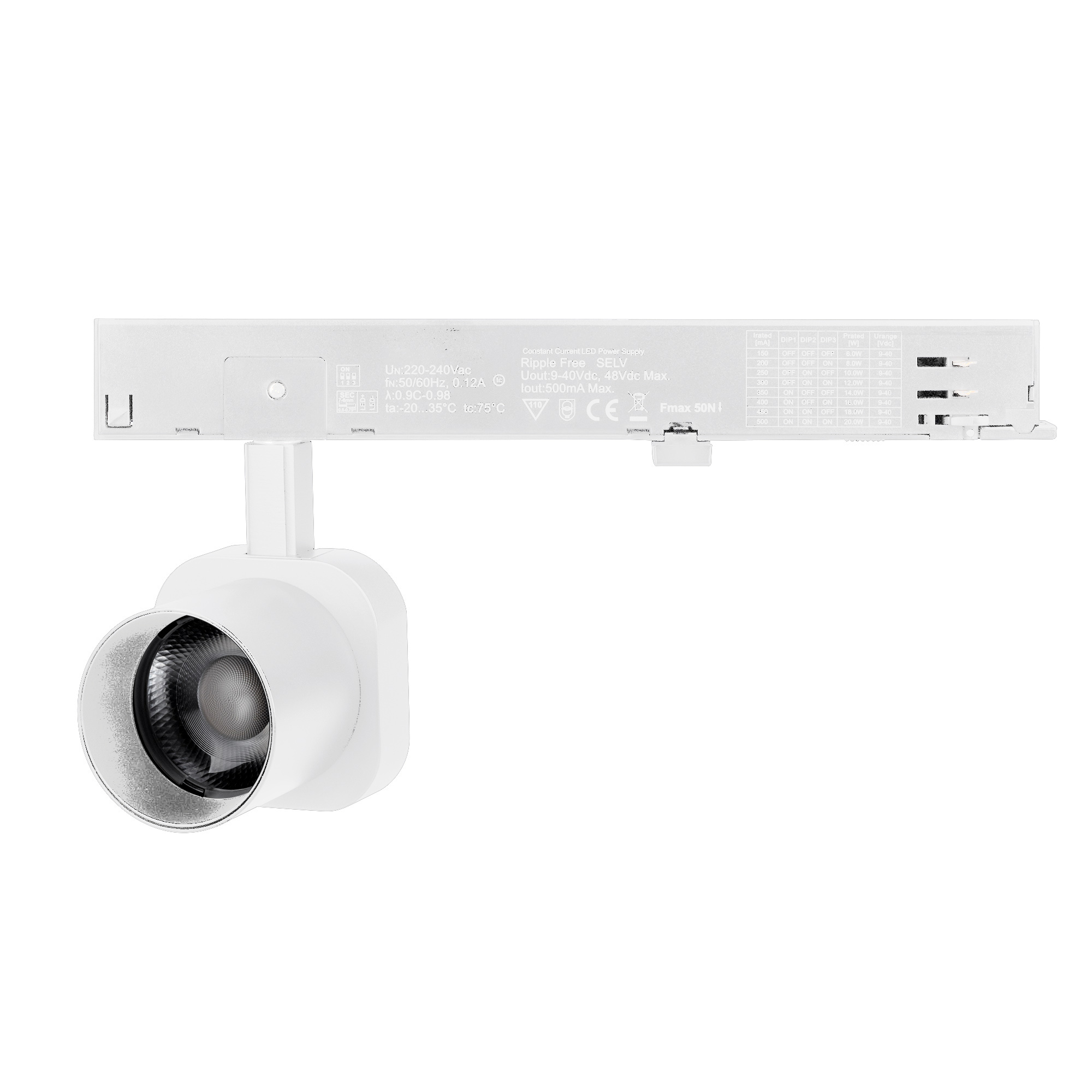 Светильник для треков/шин 4 провода. Мощность 10 Вт, св. поток 800 лм, 80 лм/Вт, теплый 2700 K, CRI>95, угол 38°, напряжение питания 230 В. Решетка HONEYCOMB в комплекте. Белый квадратный корпус из алюминия, материал линзы PC поликарбонат, степень защиты IP20. Размер световой части 60х60х62 мм. Монтаж на трек 3-фазный. Драйвер встроенный 9-40 В, 250мА., пульсация <1%