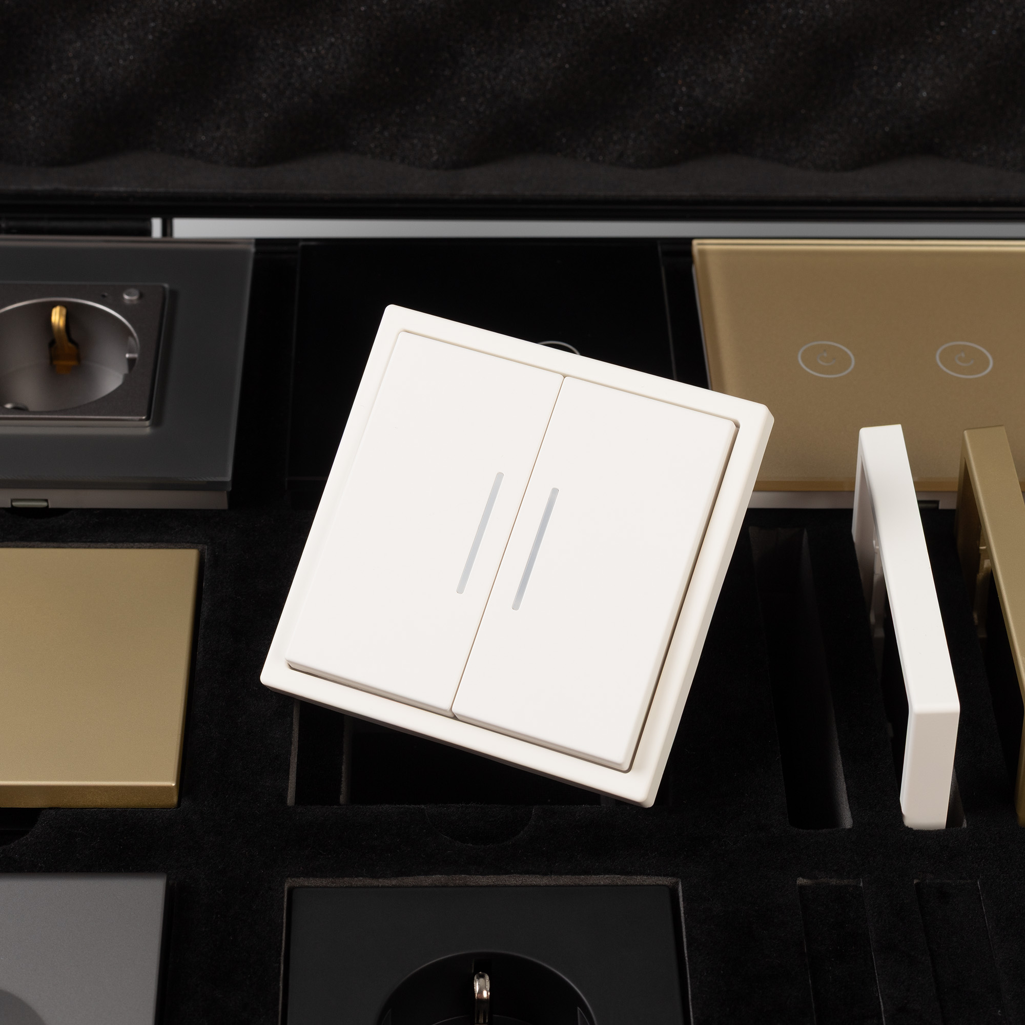 Демо-кейс с наполнением серии NOBE и OMALI. Демо-кейс содержит: Рамки серии NOBE в цветах белый, черный, золотой и серебристый (серый). Поверхность рамок имеет Soft-Touch покрытие: арт.054212 - 2шт арт.054213 - 2шт арт.054214 - 2шт арт.054211 - 2шт Механизм выключателя на одну клавишу (непроходной) в золотом цвете - арт.054253. Механизм выключателя на две клавиши с подсветкой LED (непроходной) в белом цвете - арт.054239. Механизм розетки под евровилку в черном цвете - арт.054277 Механизм розетки влагозащищенный в серебристом(сером) цвете - арт.054283 Выключатель сенсорный на одну клавишу с Zigbee управлением в белом цвете - арт.050035 Выключатель сенсорный на две клавиши с Zigbee управлением в золотом цвете - арт. 050038 Выключатель сенсорный на три клавиши с Zigbee управлением в черном цвете - арт. 050046 Розетка с Zigbee управлением в серебристом(сером) цвете - арт. 050101 Рамки представленной серии накладного типа монтажа - не требуют дополнительного оборудования для установки рамки на механизме.