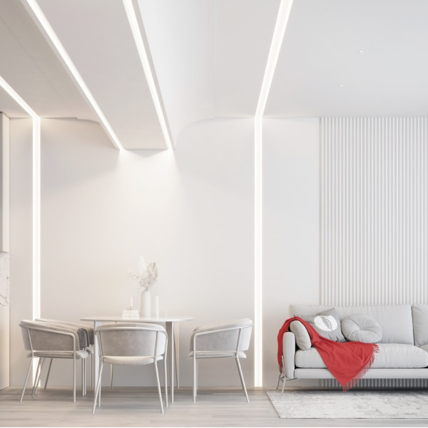 Модель DUAL обладает мягким двусторонним свечением внутрь, что придает световой линии эффект объема. В свою очередь, профиль BEVEL с боковым свечением идеально подходит для основного освещения.