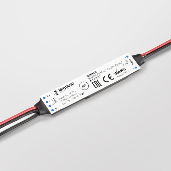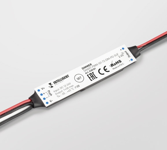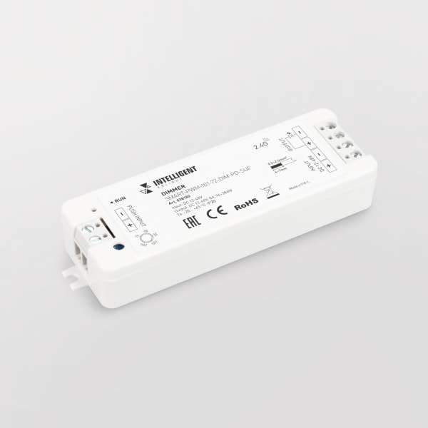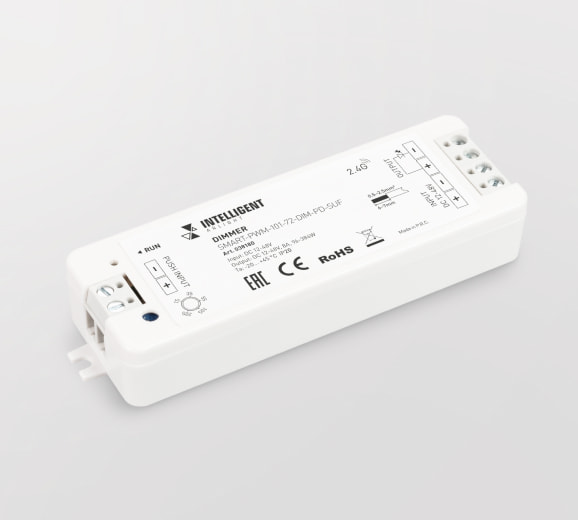 Диммер серии SMART предназначен для управления монохромными лентами. Предусмотрена функция «плавный старт», а также возможна настройка скорости диммирования от 1 до 20 секунд.