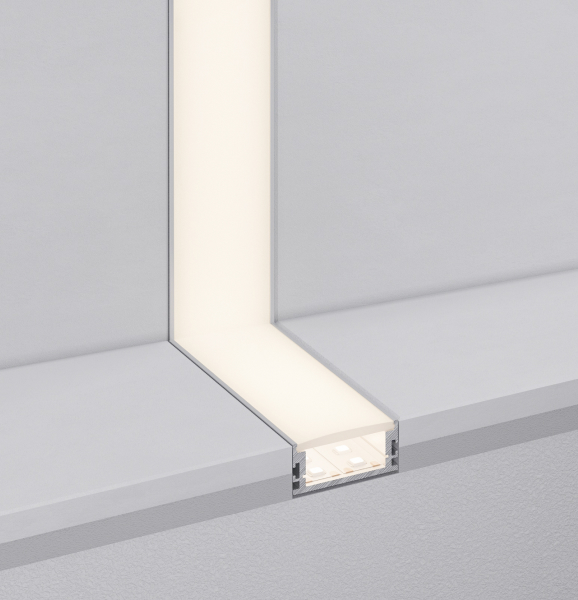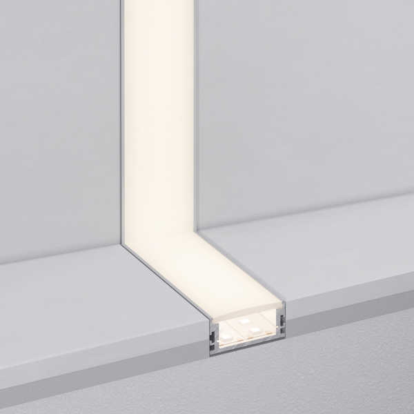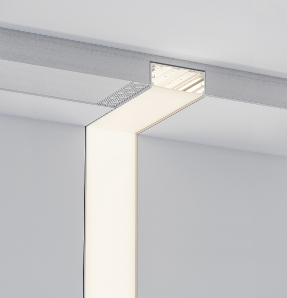 Представляем серию из трех профилей, которые складываются в единую световую линию: пол — стена — потолок. Ширина световой линии составляет 55 мм, что позволяет создать как основное освещение, так и декоративное контурное.