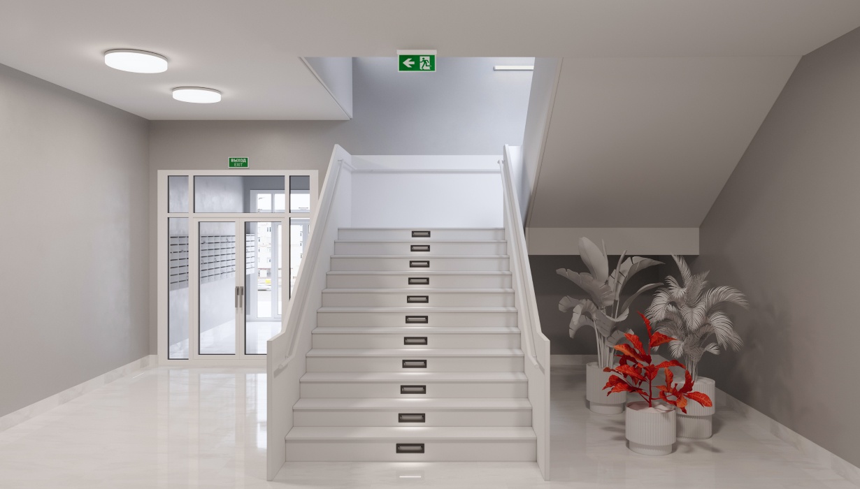 Для пространств с большой проходимостью подойдет панель EMG DIRECT. Благодаря повышенной ударопрочности поверхность панели выдерживает несильные удары (до 0.5 Дж). Также панель содержит дополнительный источник света, направленный вниз, что поможет лучше ориентироваться в пространстве.