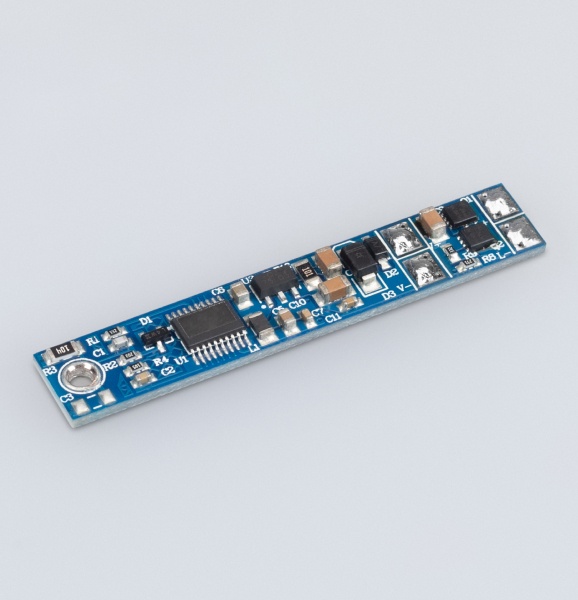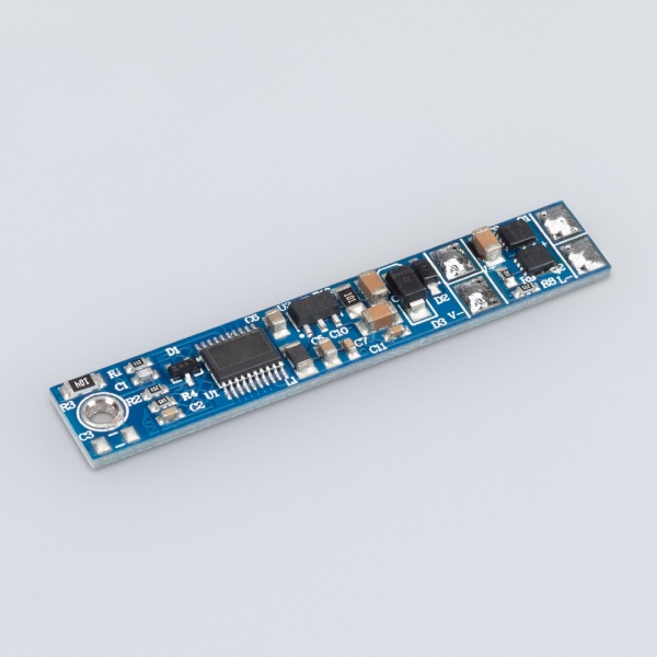 Диммер устанавливается внутрь линейного светильника и фиксируется на поверхности профиля. При прикосновении к любой металлической части профиля происходит включение/выключение света, а при удерживании — изменение яркости свечения ленты.