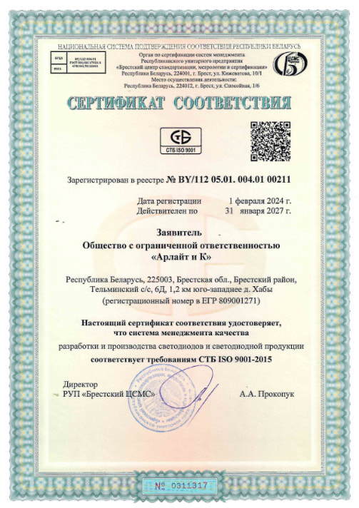 Управление заводом «Арлайт и К» по стандарту ISO 9001 — залог надежности и качества производимой светодиодной продукции. Получение данного сертификата позволяет укрепить доверие клиентов и вывести партнерские отношения на новый уровень.