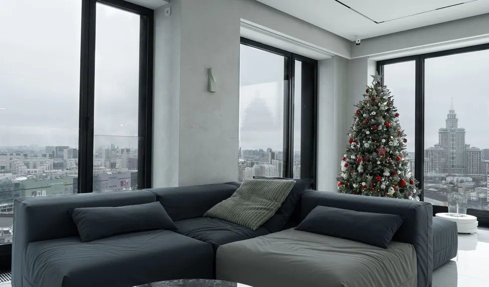 В каждой комнате — квадратное панорамное окно, пропускающее внутрь много естественного света, что является одновременно и вызовом, и возможностью для светодизайна. В кухне-гостиной встроенная линия трека повторяет геометрию окон, а установленные в шинопровод светильники полностью интегрированы в потолок и практически незаметны.