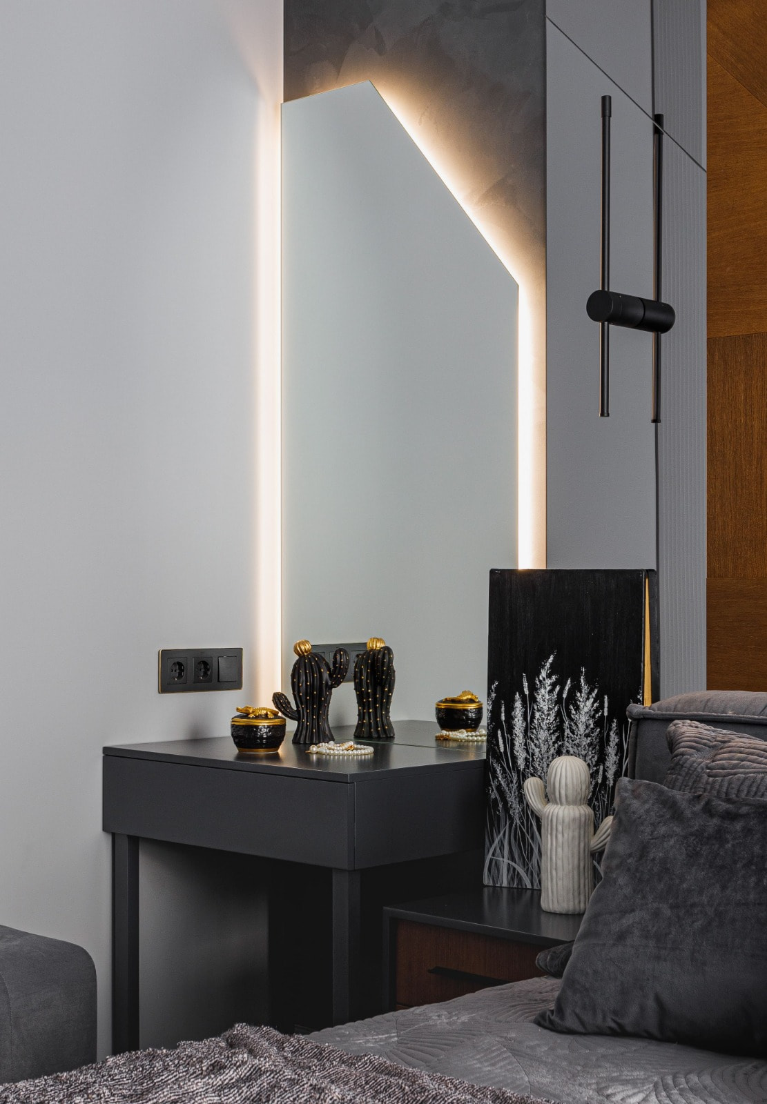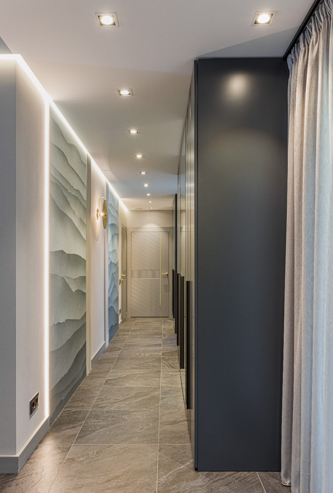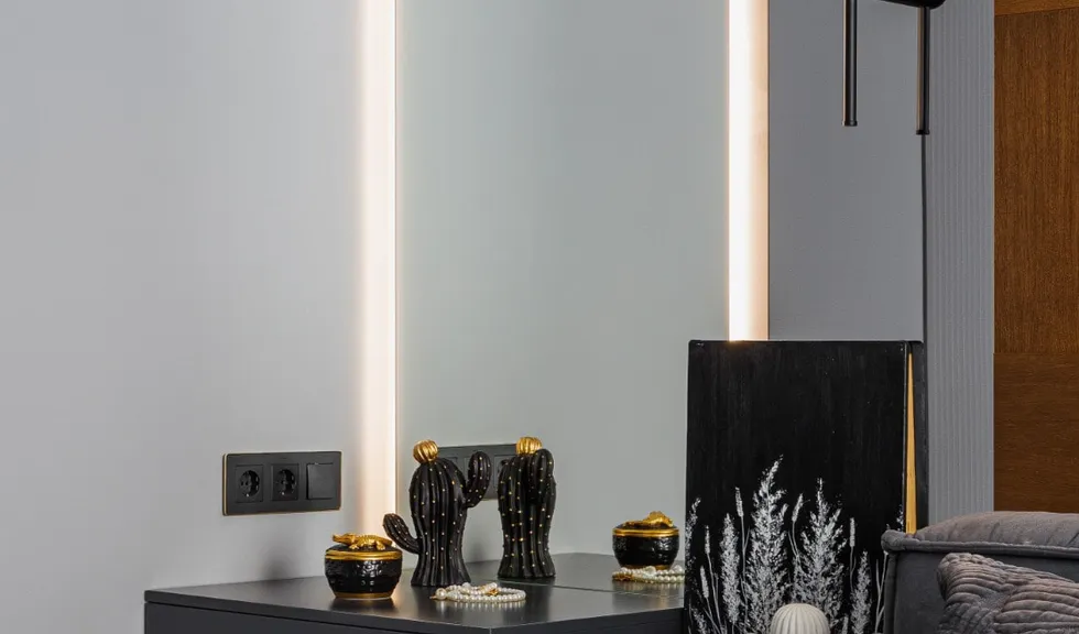 Для создания подсветки в проекте применяются светодиодные ленты Arlight белого теплого цвета свечения (3000 К), в котором серая цветовая гамма выглядит особенно мягко и уютно.