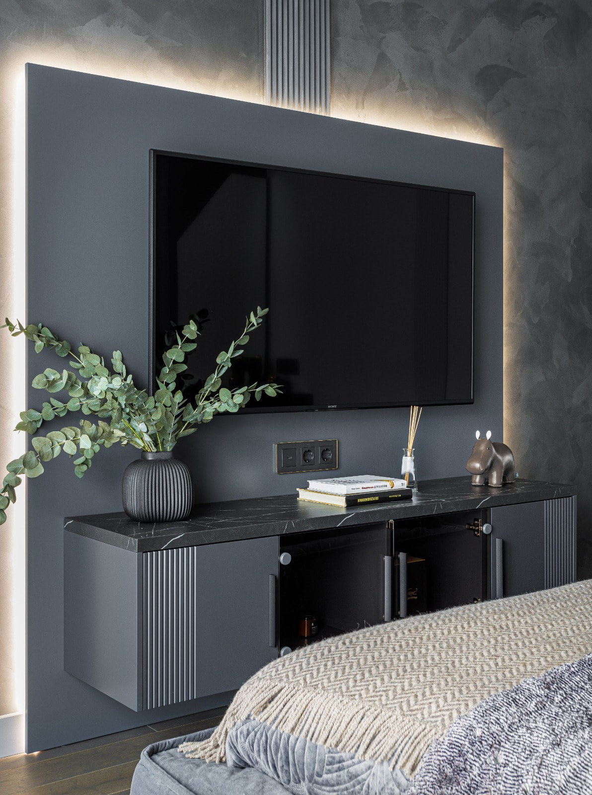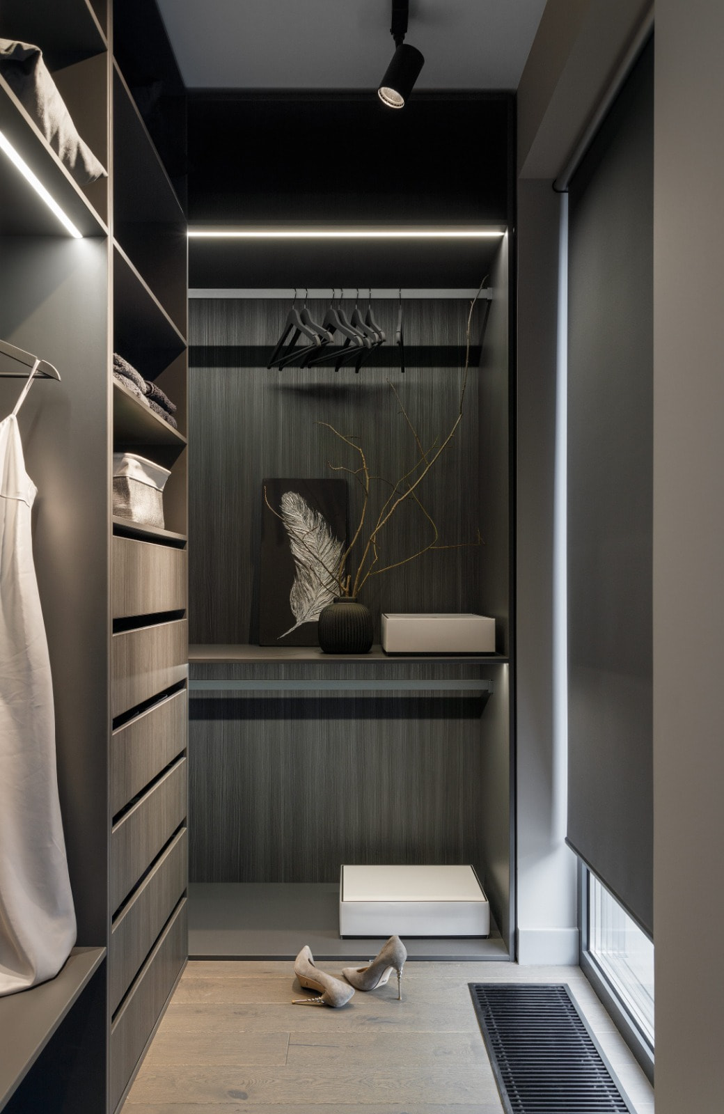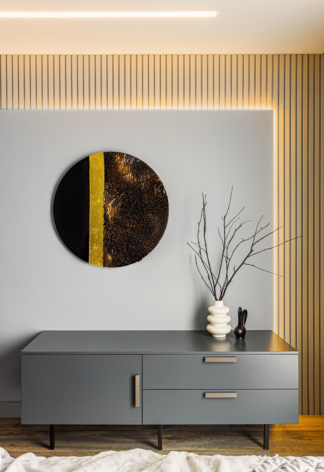 Для создания подсветки в проекте применяются светодиодные ленты Arlight белого теплого цвета свечения (3000 К), в котором серая цветовая гамма выглядит особенно мягко и уютно.