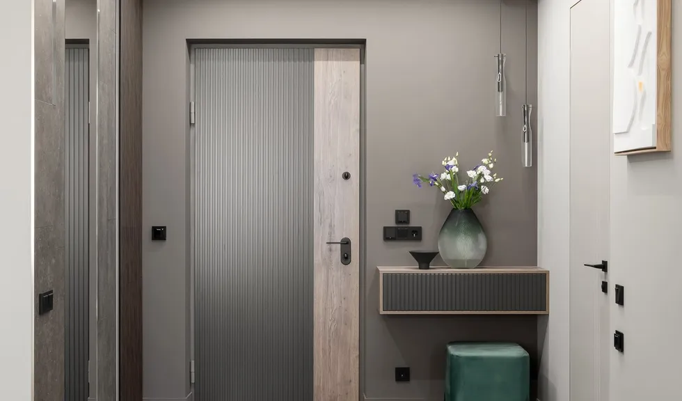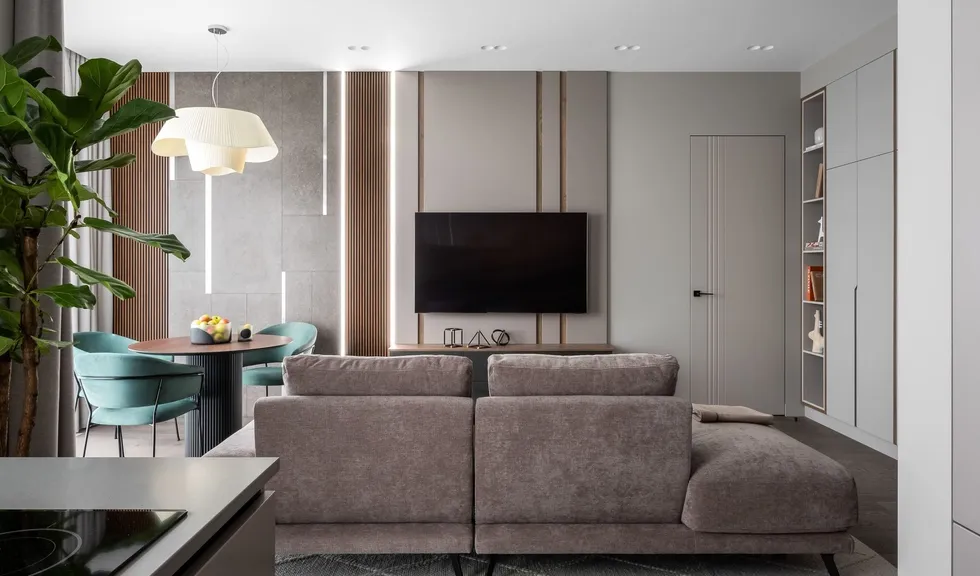 Месторасположение ЖК Spires во многом определило концепцию интерьера. За панорамными окнами квартиры на Нежинской улице в Москве раскинулся лесной пейзаж, который «проник» и внутрь пространства. Теплая цветовая гамма, состоящая из таупа, серого и белого оттенков, разбавлена элементами освежающего изумрудного цвета, а стены спальни украшены минималистичными фотообоями с изображением туманного леса.