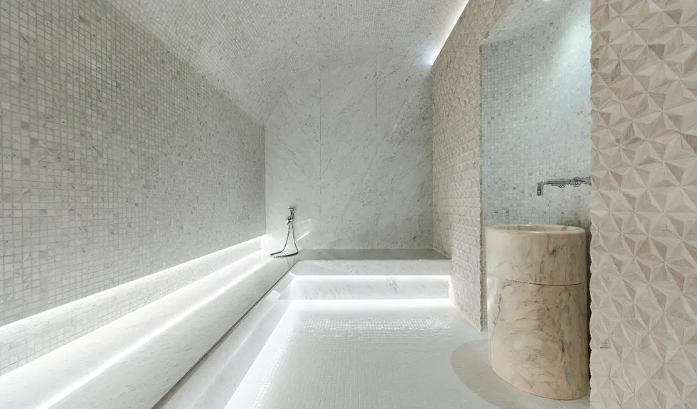 Еще одно особое пространство в фитнес-центре — термальные SPA-зоны. Для освещения финской сауны была использована герметичная светодиодная лента со степенью пылевлагозащиты IP68 и широким диапазоном рабочих температур. Умеренная яркость ленты органично рифмуется с деревянной отделкой, создавая расслабляющую и уютную атмосферу. Интерьер традиционного хаммама выполнен в аутентичном восточном стиле в светлых тонах. Подсветка белого цвета свечения подчеркивает легкую цветовую гамму и создает ощущение чистоты.