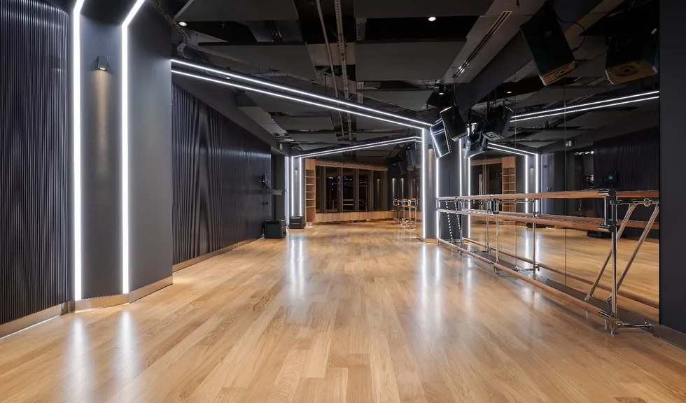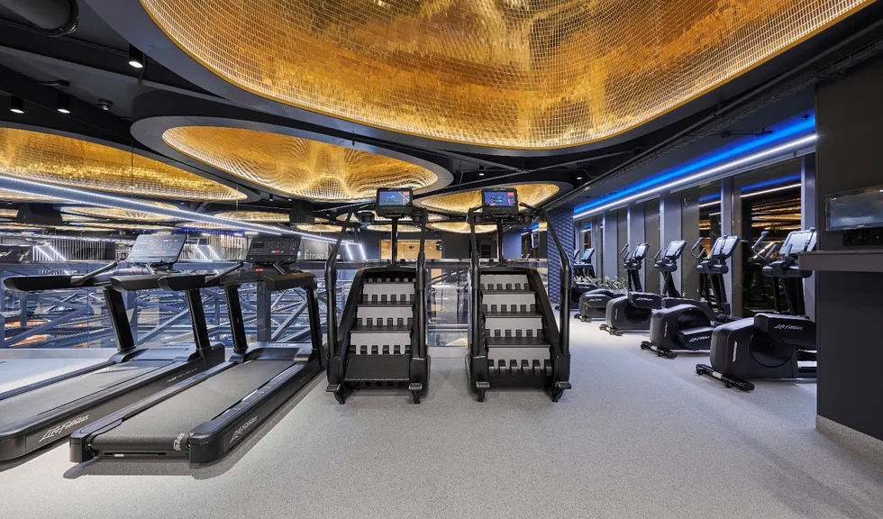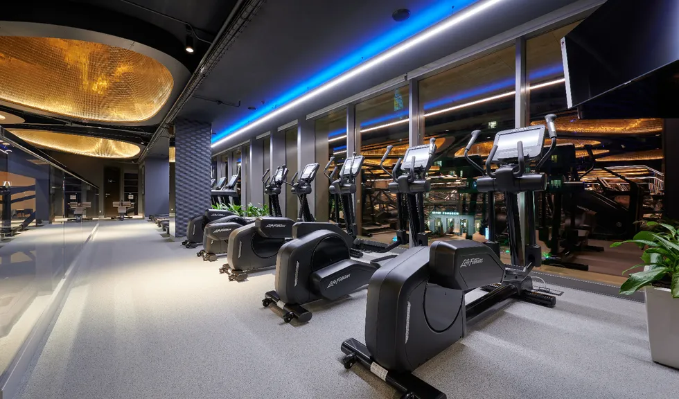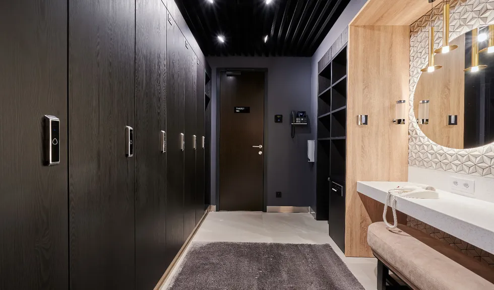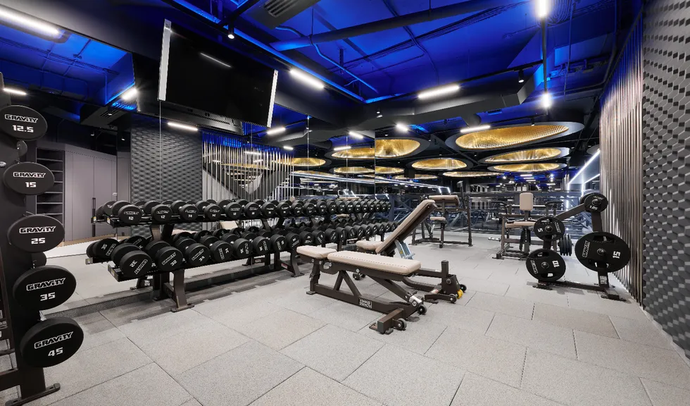 Просторные и стильные тренажерные залы оборудованы новейшей техникой для эффективных и безопасных тренировок. Особую атмосферу в зале создает тщательно продуманное освещение. Оно не только не мешает во время тренировок, но и привносит в пространство футуристические мотивы. Подсветка из линий света холодного белого и синего цветов задает мотивирующий настрой, в то время как золотистая инсталляция на потолке в свете гибкого неона теплого свечения является олицетворением премиальности. Стильные и уютные раздевалки также оборудованы RGB-подсветкой, которая эффектно направлена на открытые потолочные коммуникации. Зеркала подсвечиваются вертикальными линиями света дневного белого свечения, которое лучше всего передает естественные оттенки кожи.
