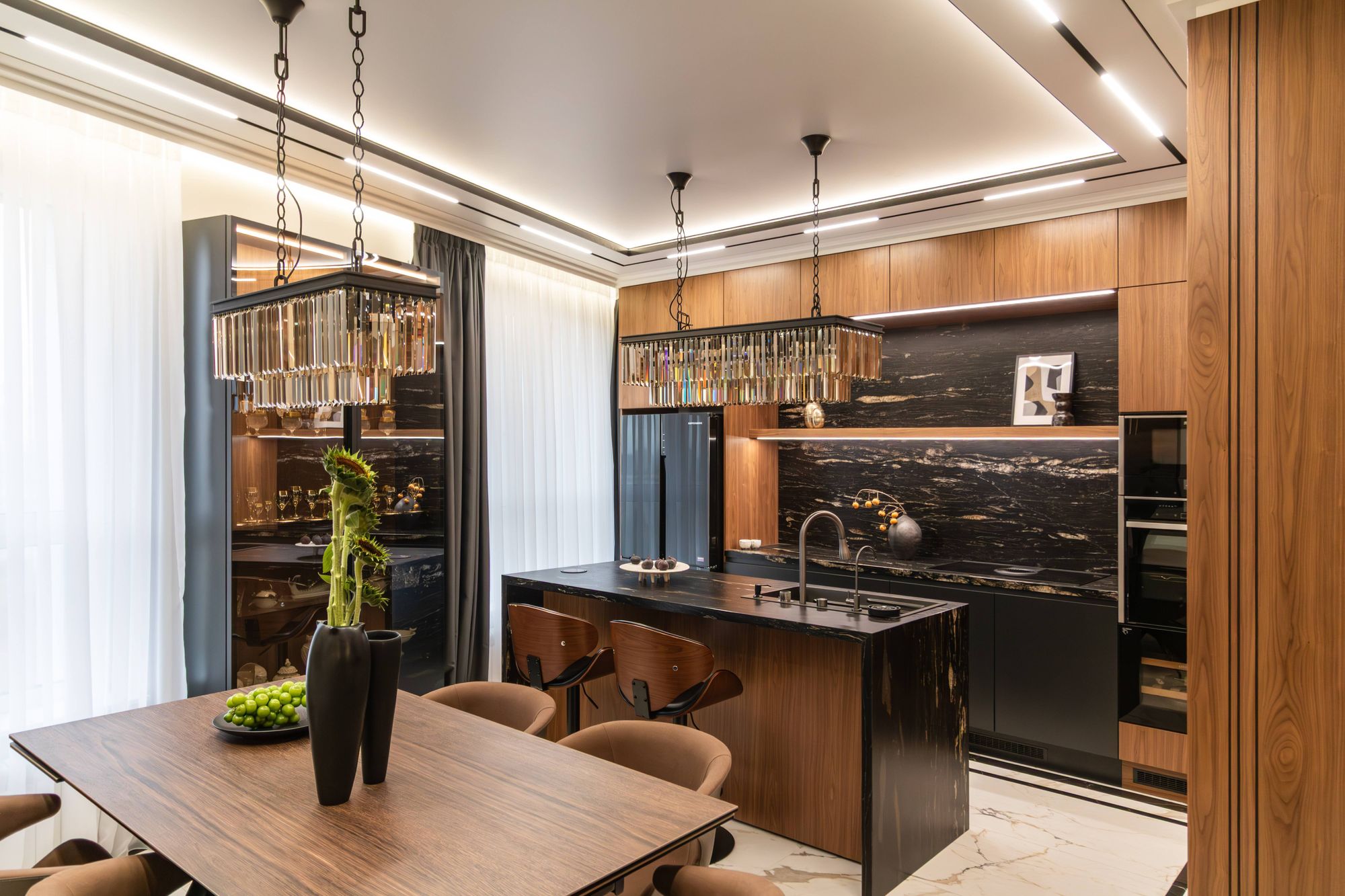 Реализация: дизайнер и основатель бюро YURTAEVA DESIGN Евгения Юртаева совместила кухню, столовую и гостиную, а на остальных «квадратах» расположила спальни с гардеробными и санузлы. Основными цветами интерьера стали контрастные черный, белый, бежевый и коричневый. Отдельное внимание Евгения уделила освещению, сделав его многослойным и отвечающим самым разным потребностям заказчика.