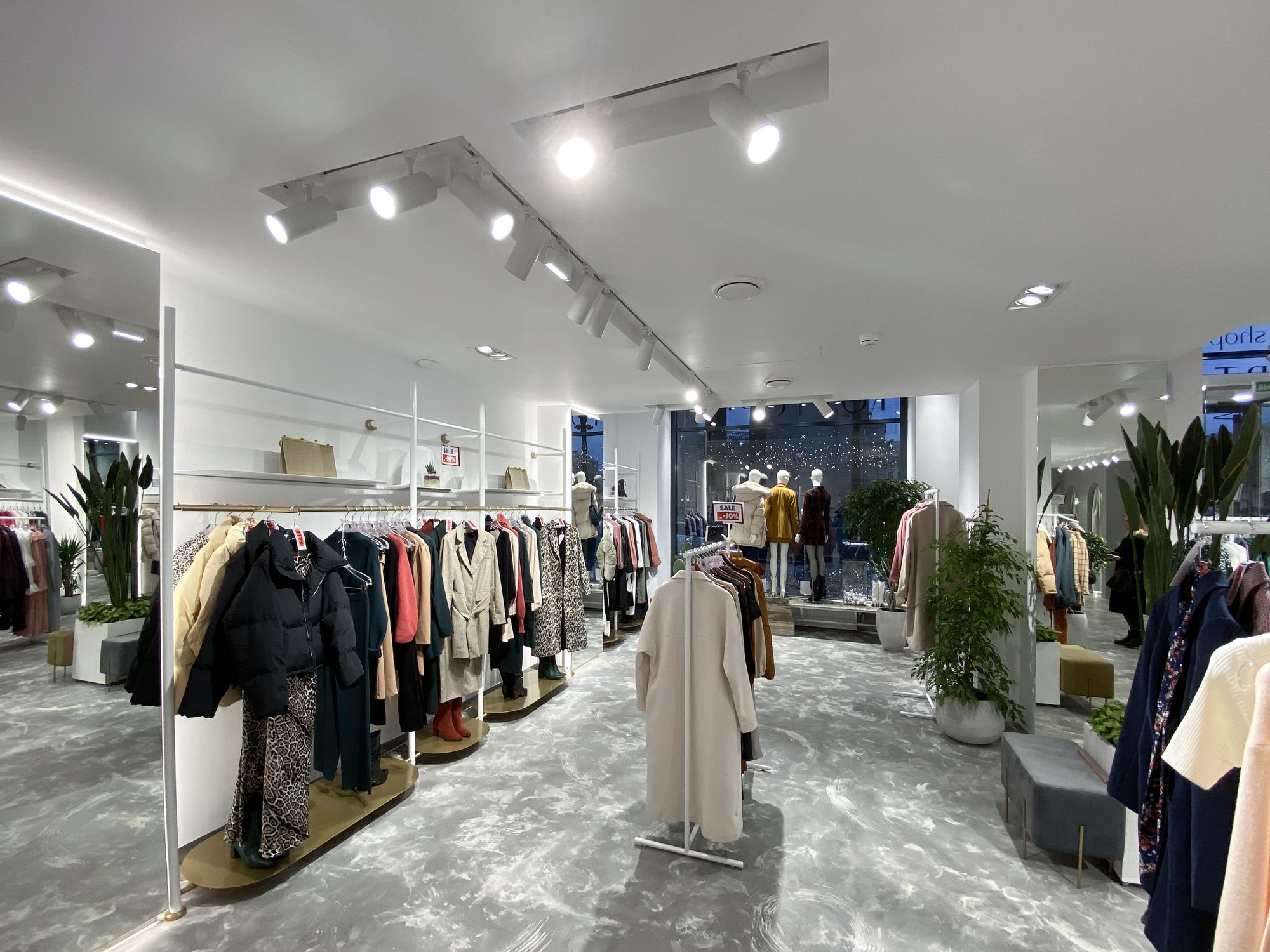 В проекте использованы подвесные светильники для треков/шин и светодиодные ленты с белым свечением. За счет высокого индекса цветопередачи достигается идеальный свет, который помогает подчеркнуть фактуру и цвет вещей, мотивируя посетителей на покупки. В помещении легко менять направление света — трековые светильники быстро перемещаются вдоль шины и позволяют расставлять световые акценты там, где это необходимо, что особенно удобно при смене сезонных коллекций.