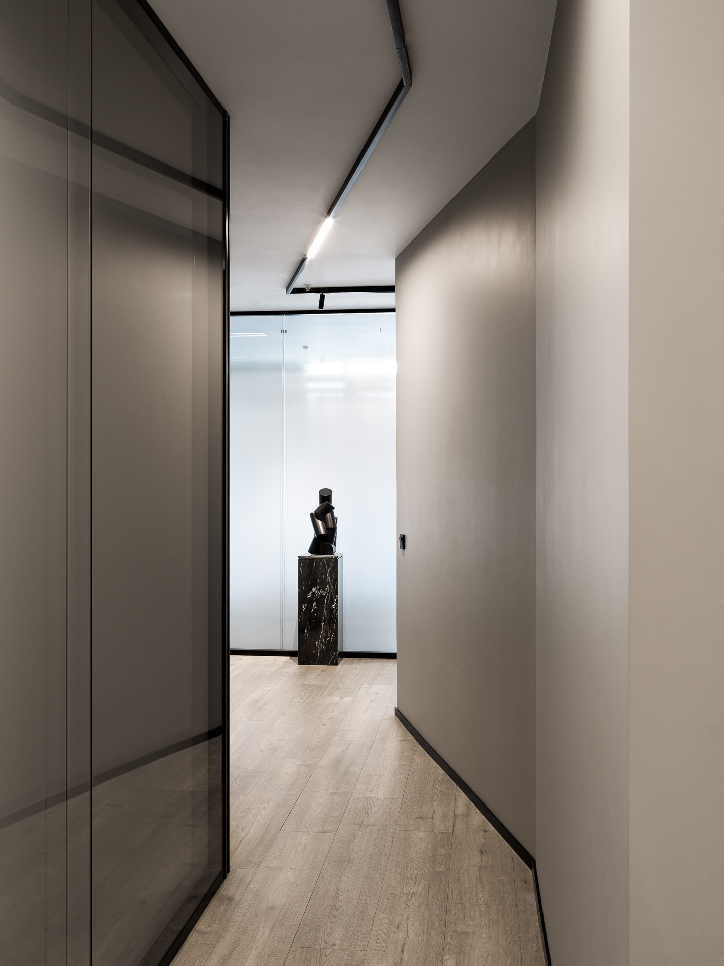 Линейные светильники LINE для кабинетов и переговорных комнат создали общий приятный свет и графичный рисунок на потолке.