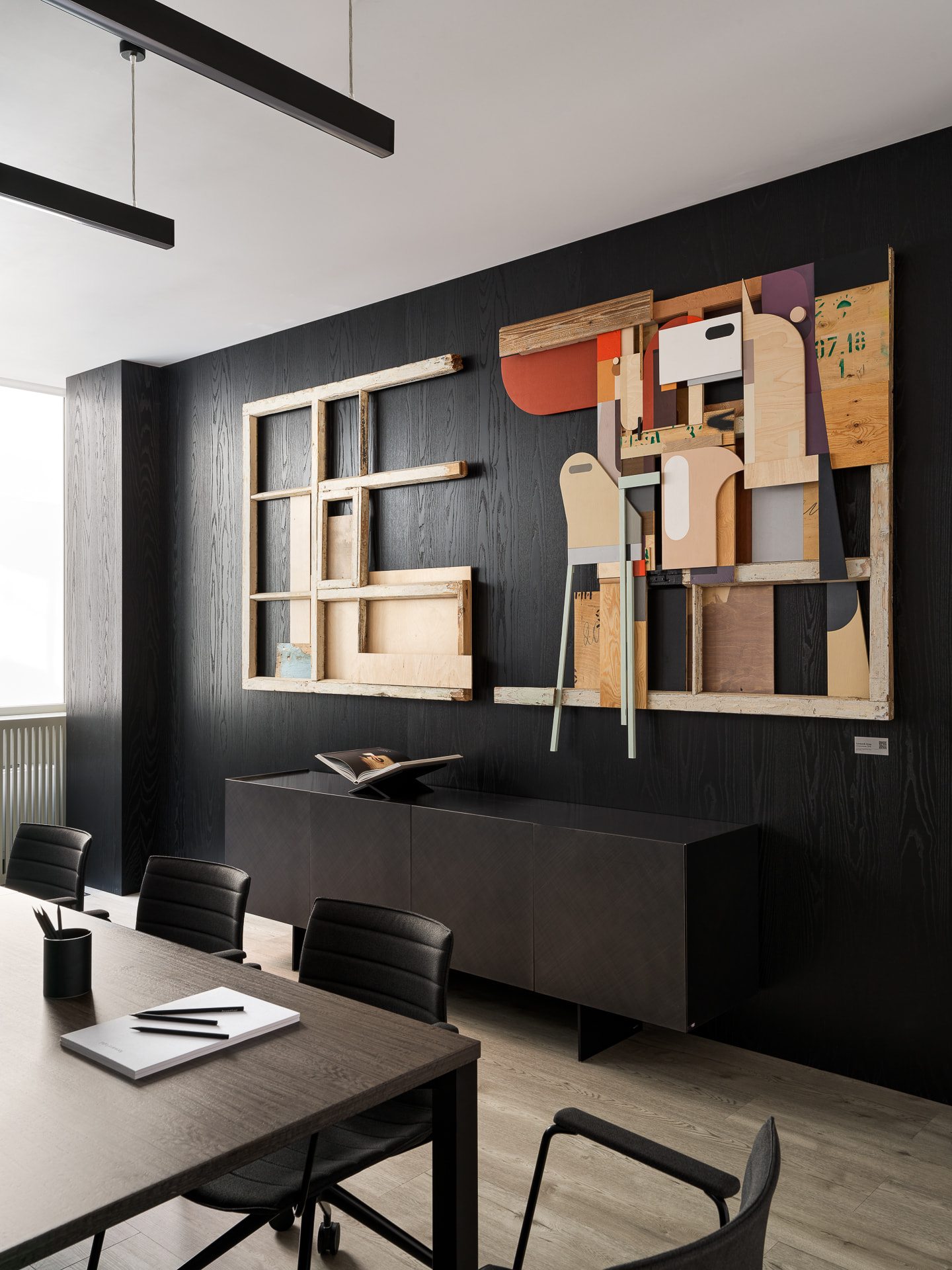 Использованные материалы: офисное пространство сделали более интересным за счет использования дерева глубокого черного цвета и натурального черного камня с выразительными белыми прожилками. Подобное сочетание материалов придало интерьеру солидность и глубину.