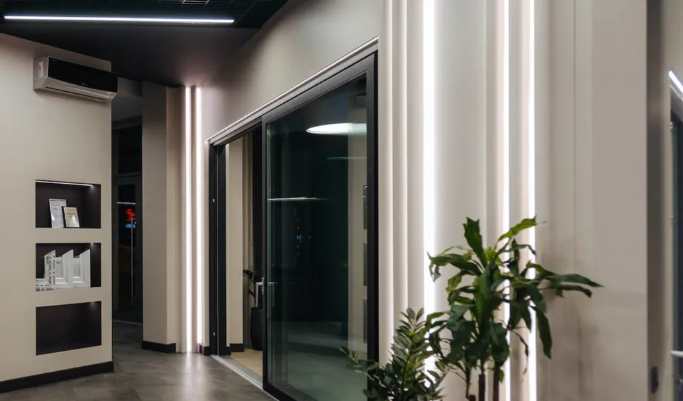 Благодаря применению качественных матовых экранов линии света не слепят и не создают резких бликов, что особенно актуально для пространства с большим количеством стеклянных поверхностей.