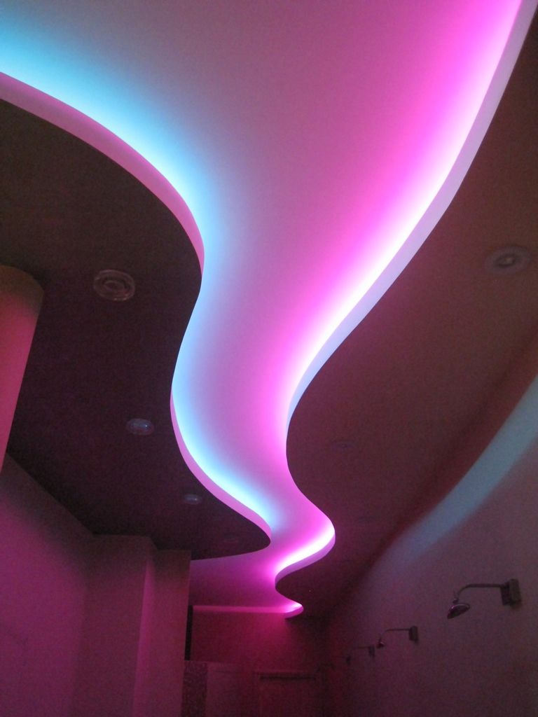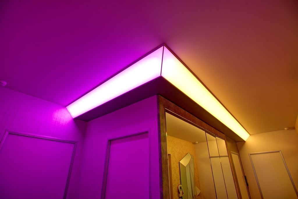 Первый вариант - закарнизная подсветка по периметру помещения. Возможны различные варианты исполнения такой подсветки: подсветка только белой светодиодной лентой с диммированием или без диммирования, подсветка только RGB светодиодной лентой с RGB контроллером, также возможно применение одновременно и многоцветной, и белой светодиодной ленты с регулировкой яркости и выбором цвета.