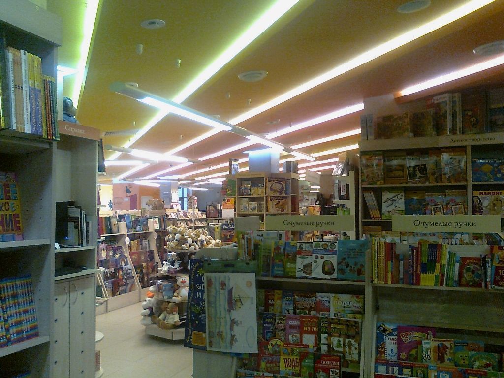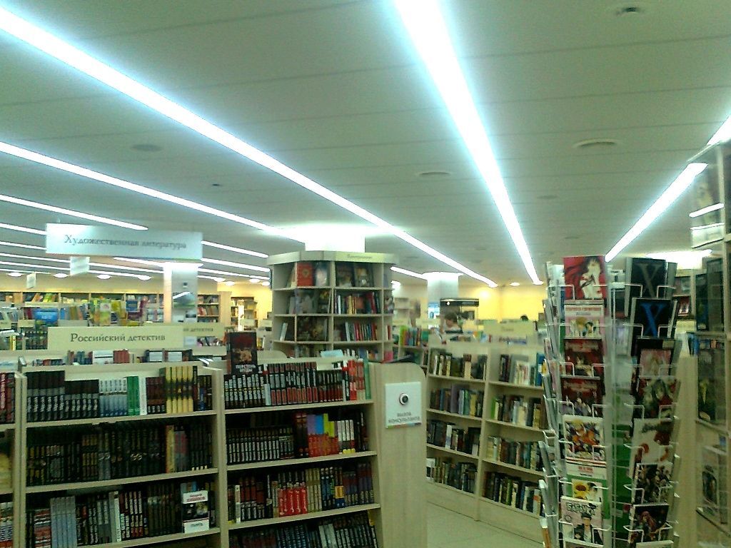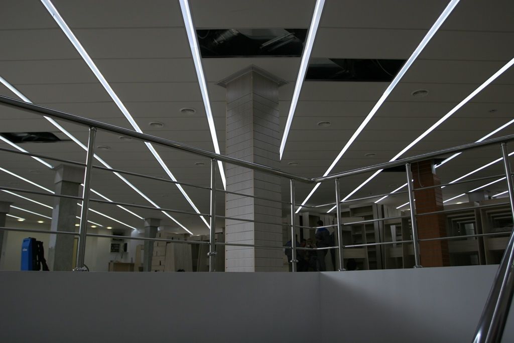 Светодиодное освещение торговых площадей в книжном магазине было выполнено двумя способами. Первый - освещение многоуровневого гипсокартонного потолка, второй - линейные светильники с матовым стеклом, встроенные в потолок Армстронг. Эти светильники создали эффект равномерных световых линий. В обоих вариантах освещения применялось светодиодная продукция торговой марки arlight®.