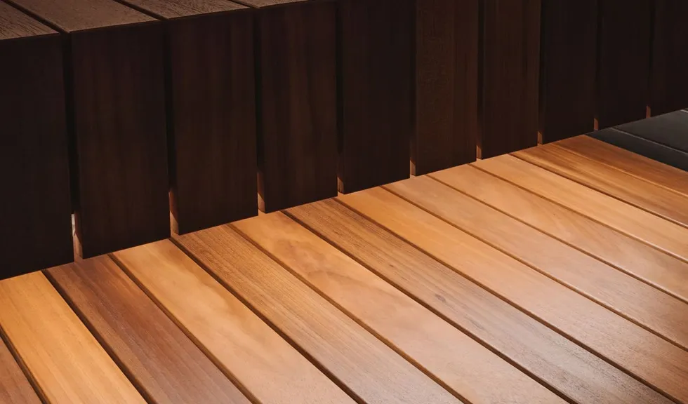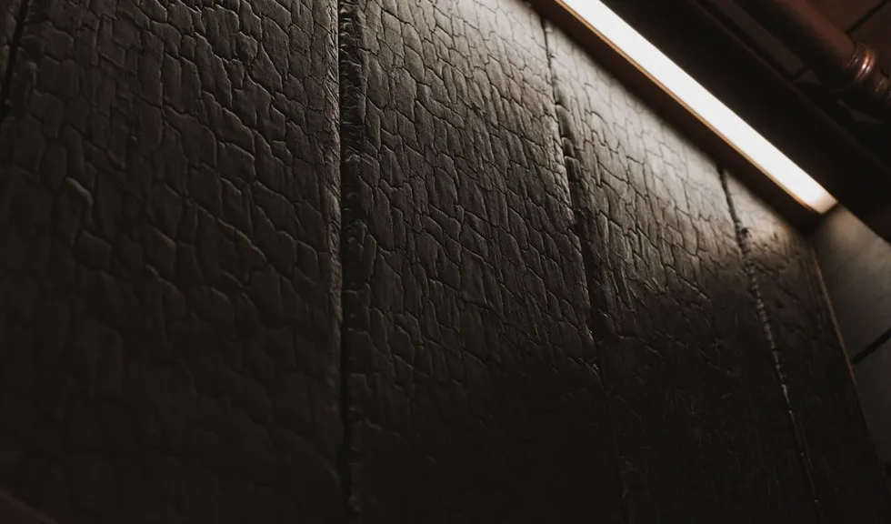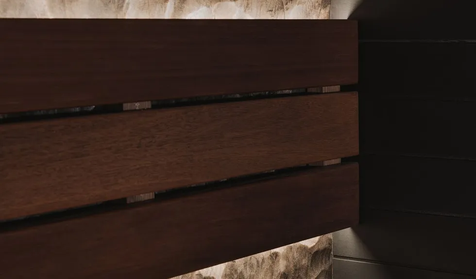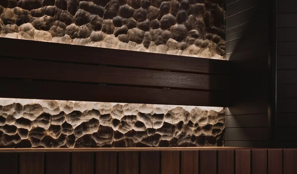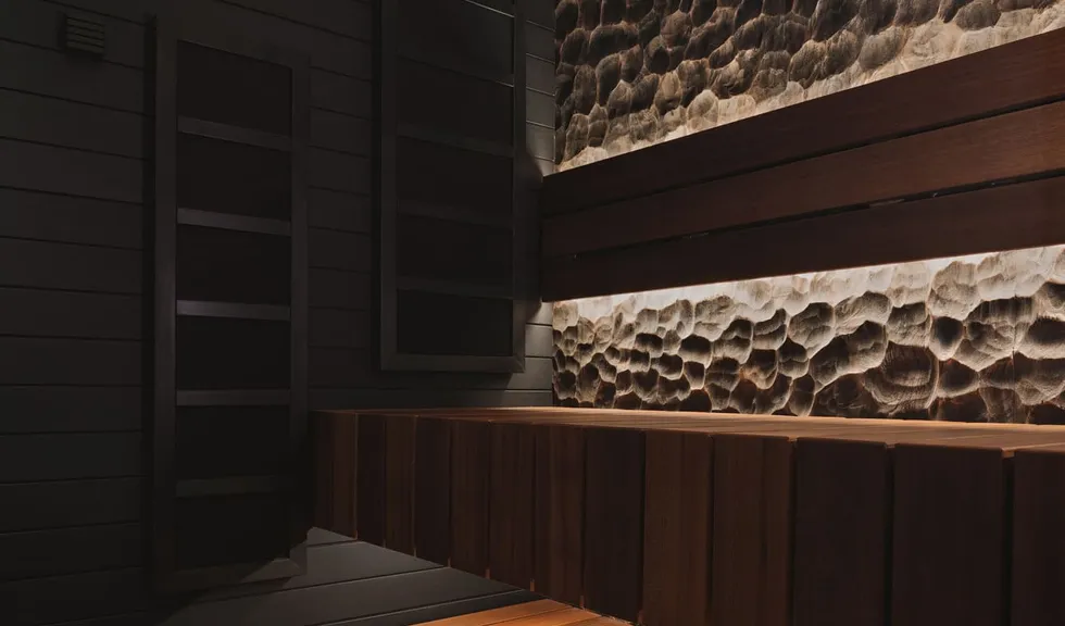 Для более расслабляющей атмосферы источники света скрыты от глаз посетителей. Светодиодные ленты установлены в накладные профили SLIM, которые обеспечивают хороший теплоотвод, что особенно важно в условиях высоких температур. Профили с лентами размещены под полка́ми, подспинниками и в пространстве между потолком и стеной. Благодаря этому в сауне создается стильный эффект «парящего» потолка, а также подчеркивается рельеф декоративной панели из обожженной древесины.