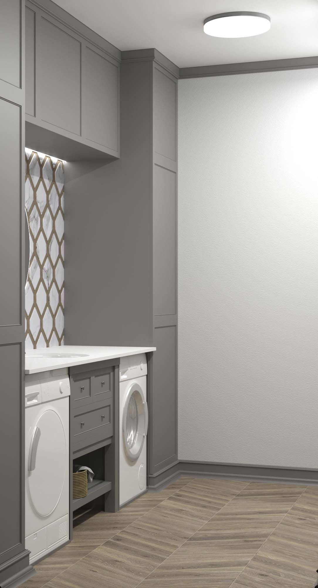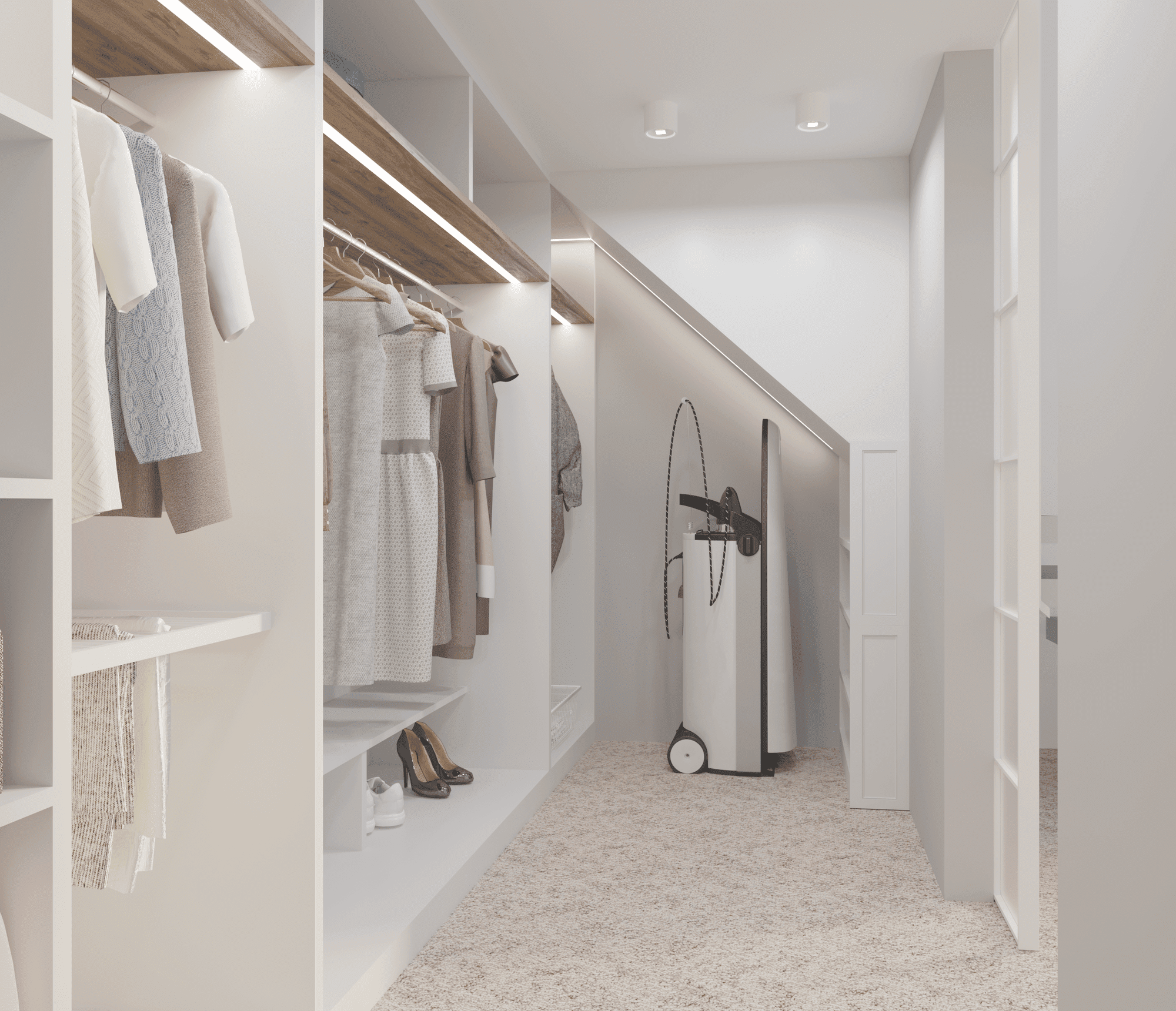 В проекте применялись анодированные профили с экраном и светодиодные ленты дневного белого свечения. Тонкие световые линии гармонично интегрированы в различные помещения. Другая часть основного освещения создана с помощью больших потолочных светильников, которые выразительно контрастируют с простыми линейными светильниками.